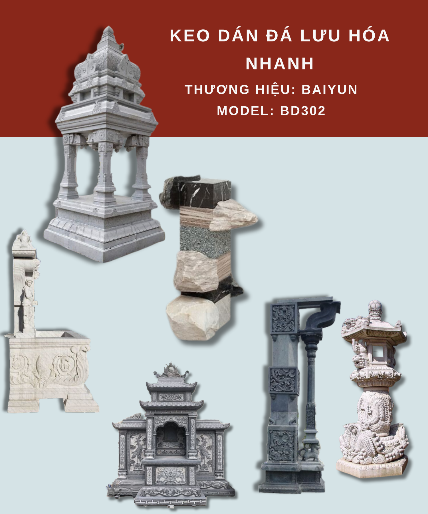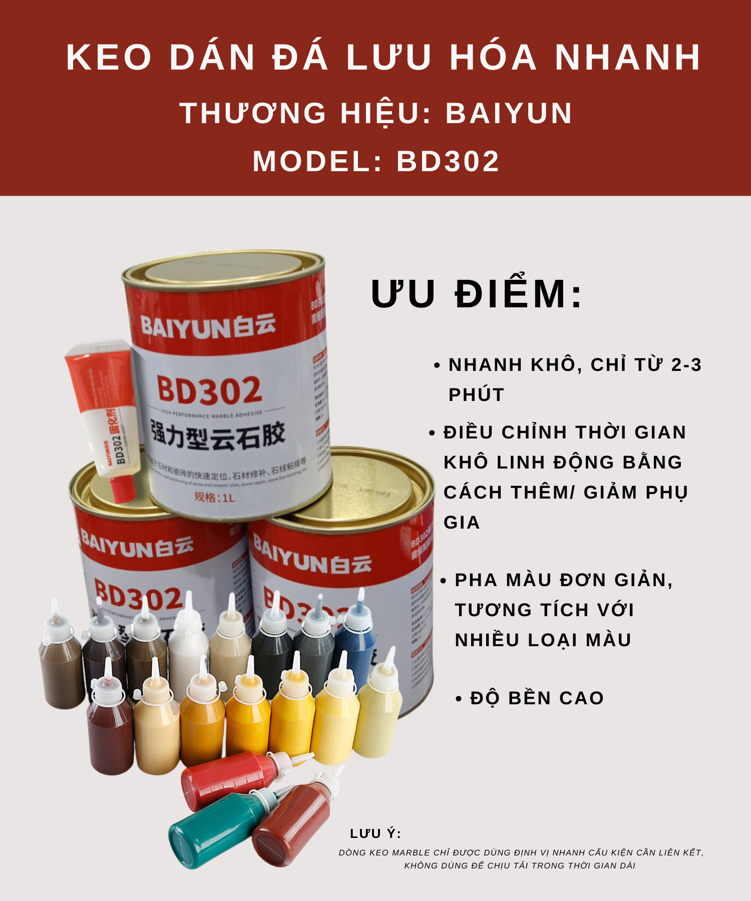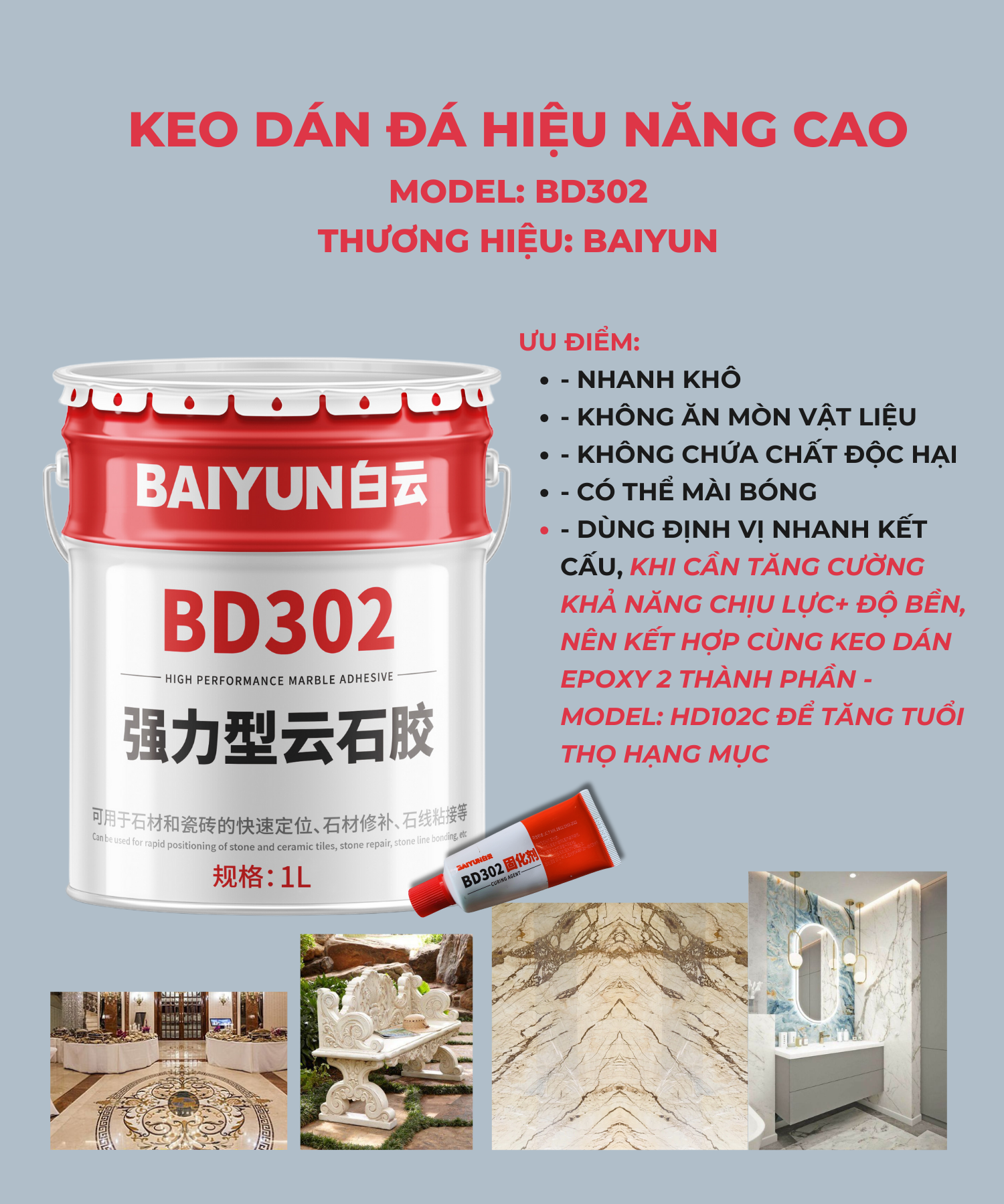 KEO BAIYUN DÁN ĐÁ BD302 LÀ DÒNG KEO POLYME NHỰA KẾT DÍNH NHANH KHÔ, KHÔNG BÃO HÒA 2 THÀNH PHẦN CƯỜNG ĐỘ CAO. ĐƯỢC DÙNG ĐỂ CỐ ĐỊNH NHANH VẬT LIỆU ĐÁ VÀ GẠCH SỨ, SỬA CHỮA VẬT LIỆU ĐÁ, GẮN KẾT ĐÁ.